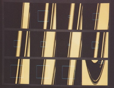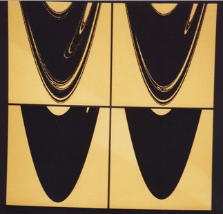 Basin of attraction (in black) for Henon attractor - in successively fine detail (bottom-right to top-left, top