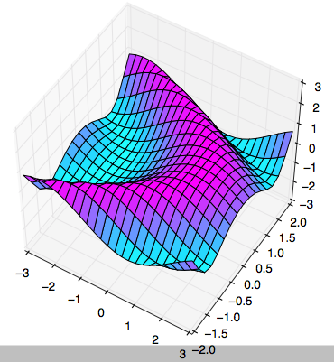 from mpl_toolkits.mplot3d import Axes3D import matplotlib.pyplot as plt import numpy as np X = np.arange(-3, 3.2,.25) Y = np.arange(-2, 2.2,.25) X, Y = np.meshgrid(X, Y) Z = np.sin(X + Y**2) fig = plt.figure() ax = fig.gca(projection='3d') surf = ax.plot_surface(X, Y, Z, rstride=1, cstride=1, cmap='cool', linewidth=1, antialiased=True) ax.set_zlim(-3.01, 3.01) fig.colorbar(surf, shrink=0.5, aspect=1) plt.show()