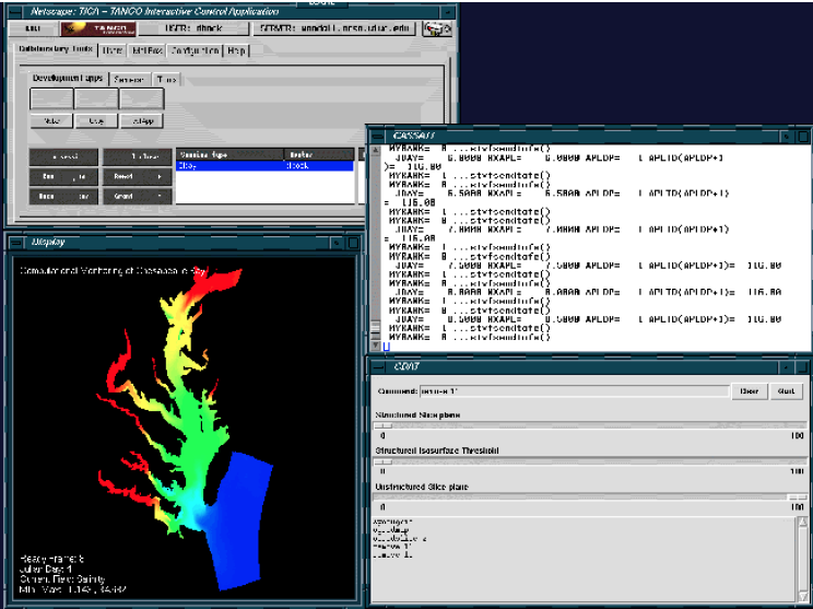 While at NCSA, I performed an informal evaluation of some HPC coprocessing systems that were available at the time. Coprocessing (or in-situ) systems allow real-time visualization of a running simulation (as opposed to doing post-processing). This was funded through a DoD HPC Modernization Program contract and was joint work with Mary Wheeler and Clint Dawson (both at UT Austin) and others. Their PCE-QUAL-ICM was a parallelized model used to perform simulation studies of the water quality of the Chesapeake Bay.
